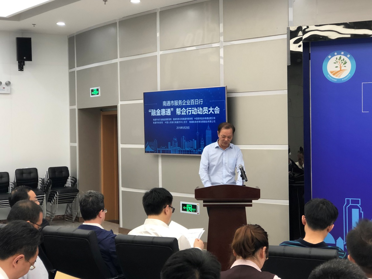 5月29日上午,南通市地方金融監(jiān)督管理局在市中小企業(yè)金融服務(wù)中心路演大廳召開“融金惠通”幫企行動動員大會。大會由南通市地方金融監(jiān)督管理局局長張乃華主持,南通市市委常委、常務(wù)副市長單曉鳴出席大會并致辭,南通產(chǎn)業(yè)控股集團有限公司副董事長顧建國作為南通陸海統(tǒng)籌發(fā)展基金代表及“融金惠通”幫企行動市直二分隊隊長進行了表態(tài)發(fā)言。